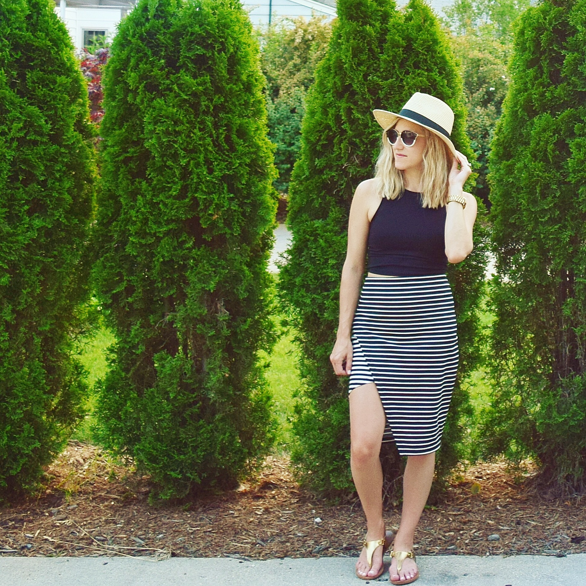 Being petite and growing a baby has thrown a curve ball into my daily dressing decisions! I have accepted most of my pants don’t fit anymore and resourcefully pulling from my current skirt and dress collections. Sharing today my striped skirt style that is one of my current faves and go to casual chic looks. This skirt was part of a skirt/crop set by Woodbury Lane purchased last year that I absolutely love! The high waist allows for it to fit over my tiny baby bump and asymmetrical cut is on trend. It also allows me to still pull off a crop top this Summer! The black solid sleeveless crop keeps the skirt stripes grounded, and has a racer-back cut that makes the look more current. Added accessories to the striped skirt style are gold flat sandals for a little glam, black and white sunnies to pull the the striped style up towards my face, and a wide-brimmed straw fedora to top it all off. I love the updated classic feel of this outfit and can be worn by anyone (unless you’re baby bump is really bulging, then please don’t attempt a crop top.) Hope you enjoyed my striped skirt style as my first outfit post for my little baby bump! I’ll never sacrifice fashion for pregnancy and stay tuned for more maternity looks as I grow my little girl until her Valentine’s Day due date!